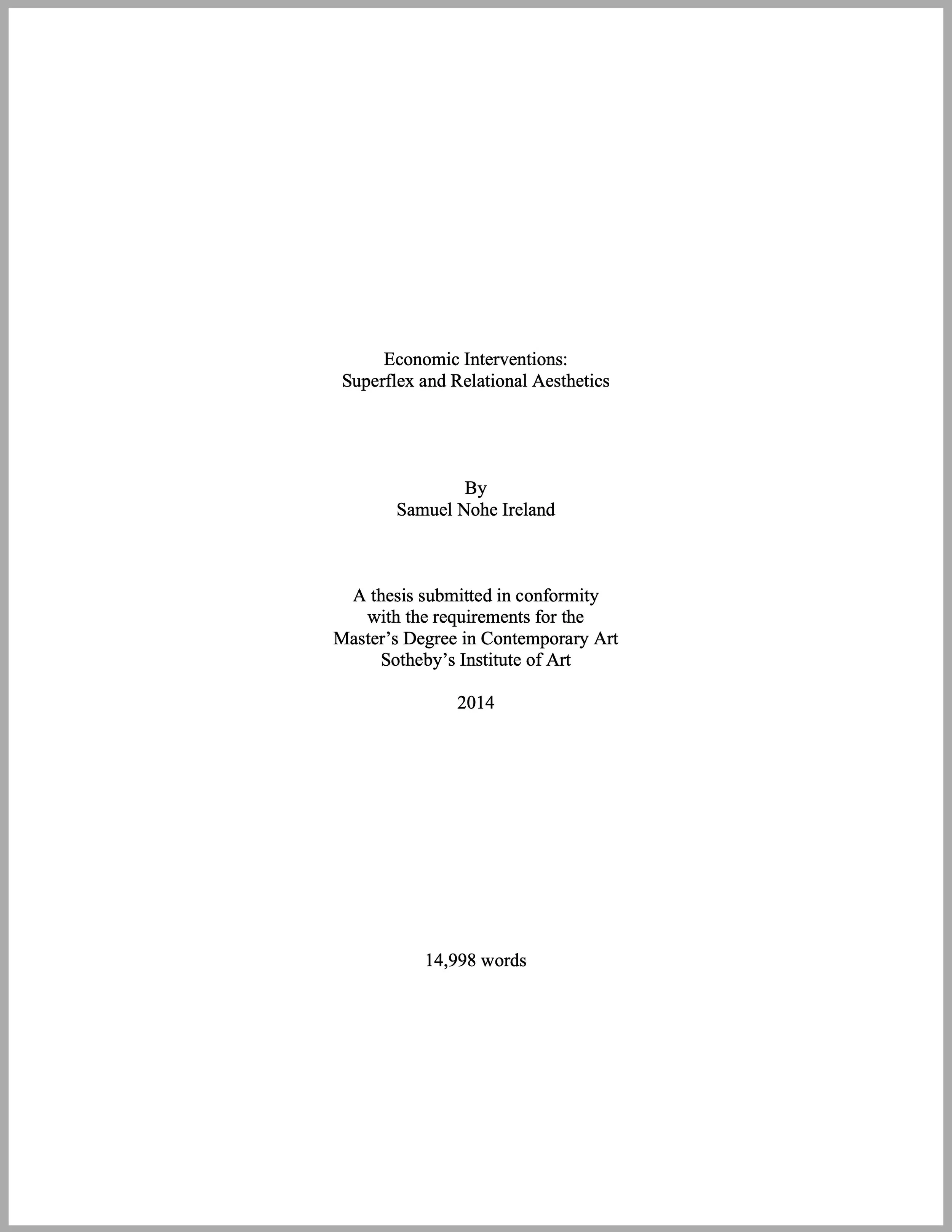 I have also provided a copy of my Sotheby’s Institute of Art Thesis (2014) written on the artistic practice of Danish art collective Superflex, known for their critiques of high corporatism/late-stage capitalism.